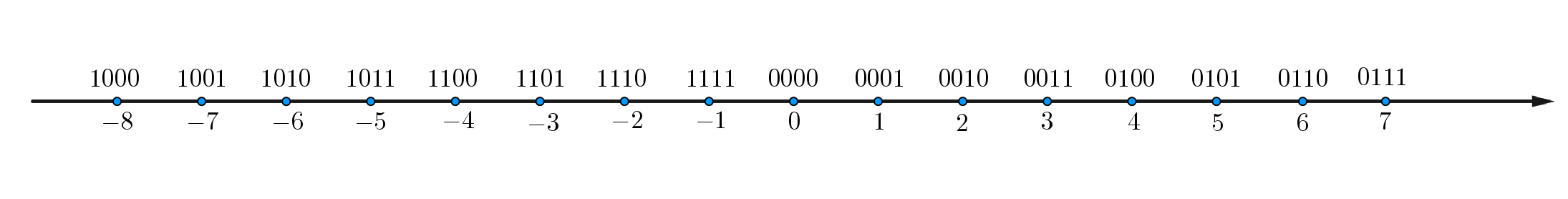 根据前面的知识,四位二进制表示的整数的范围为 [−8,7],将这些整数和对应的补码表示在数轴上如下