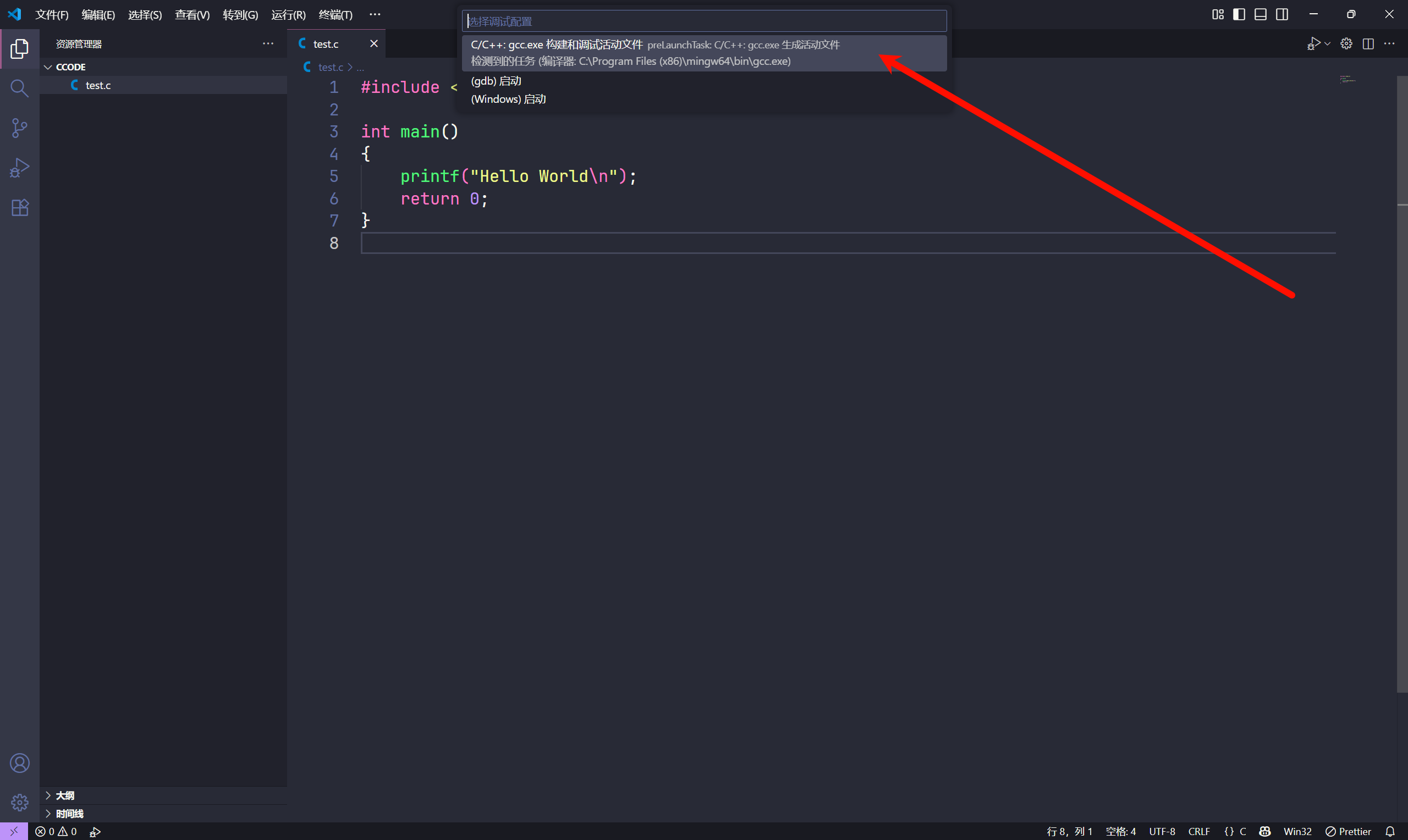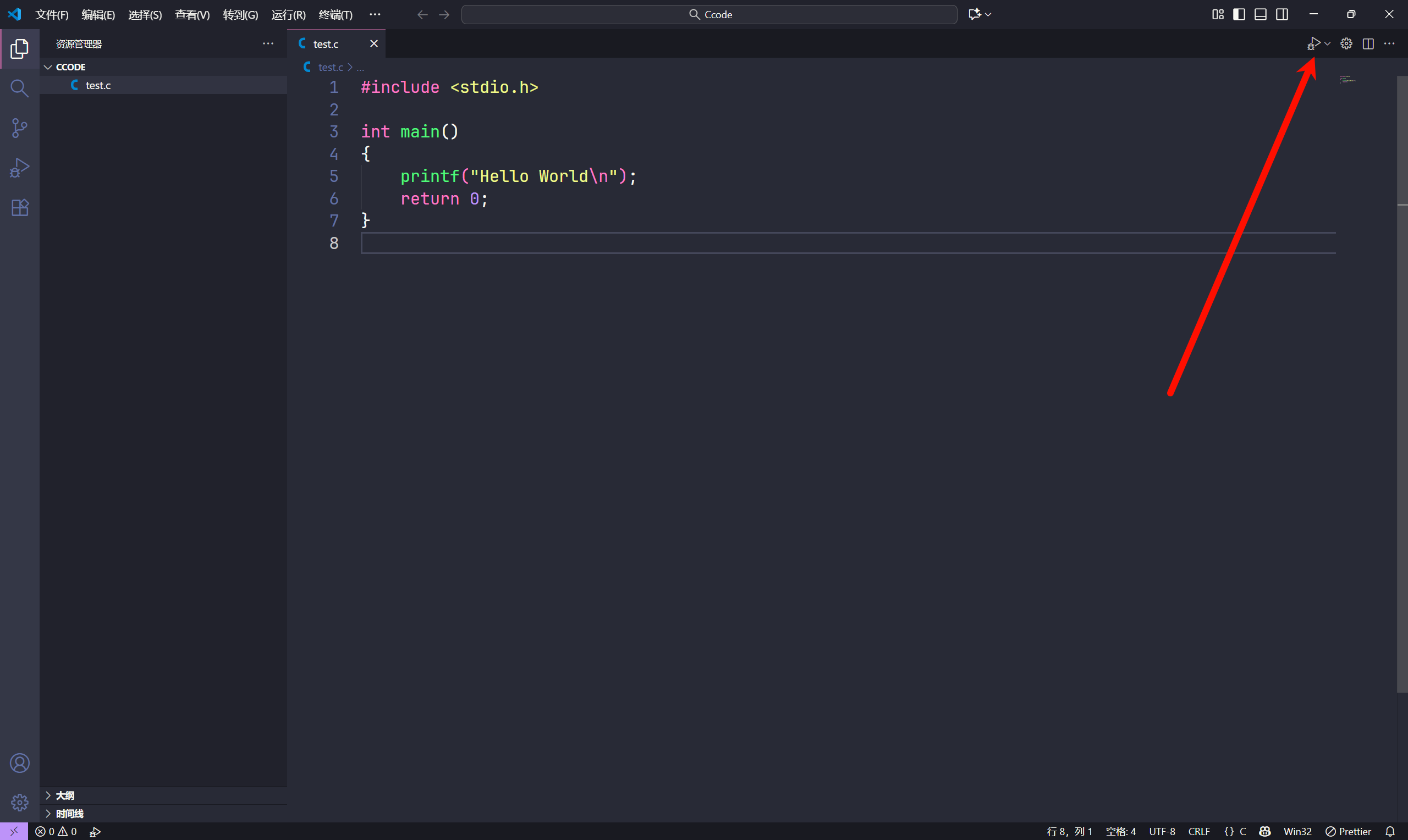 这里以 C 语言为例,我们先用 vscode 打开一个文件夹(注意路径中不能有中文),然后新建一个 C 语言文件,简单写一个程序