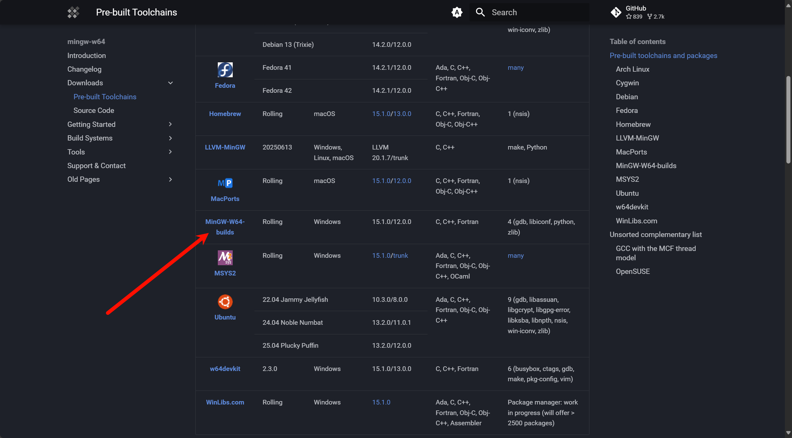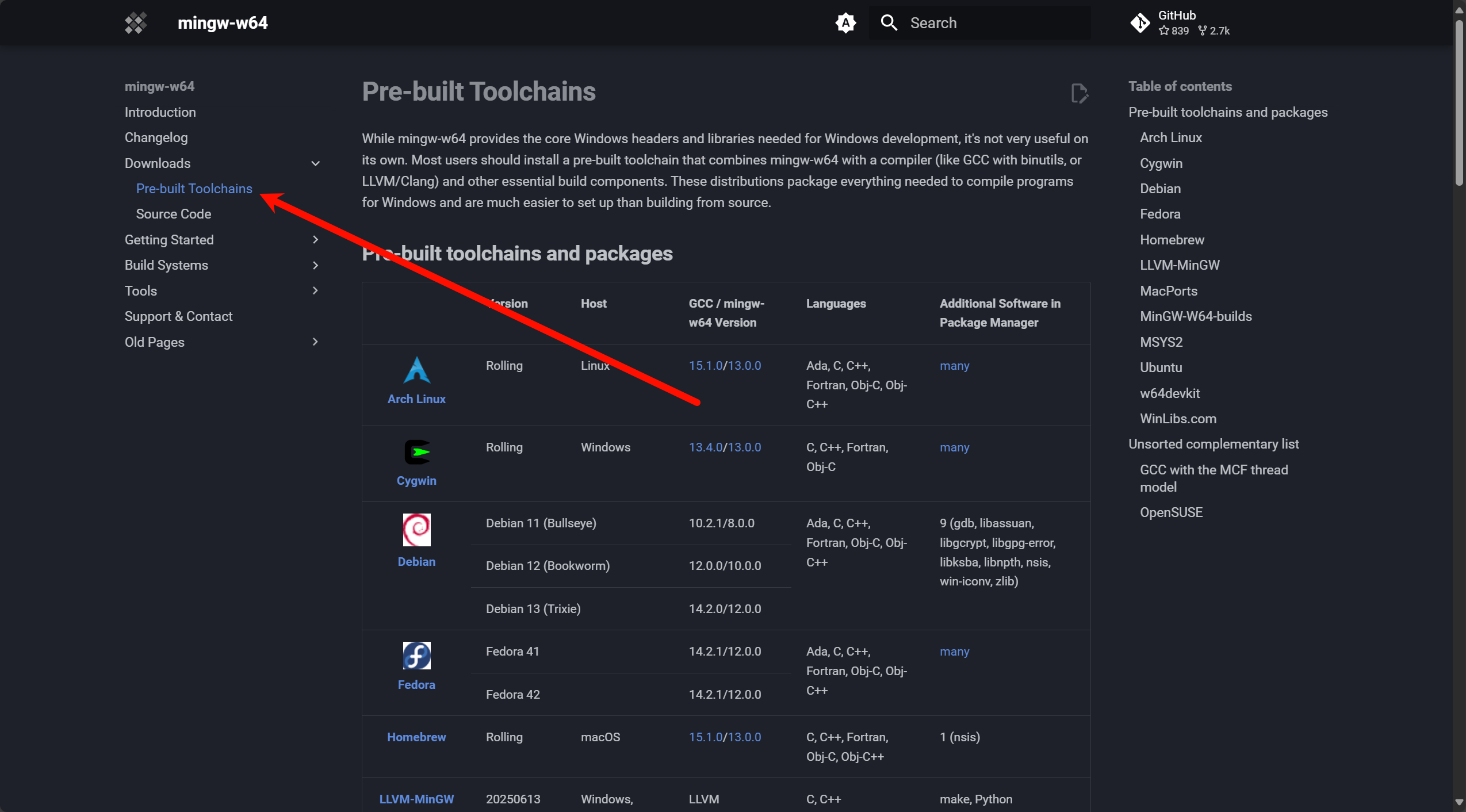 本着软件去官网下载的原则,要下载 MinGW-w64,我们先去 官网,然后可以找到 Downloads,并选择 Pre-built Toolchains