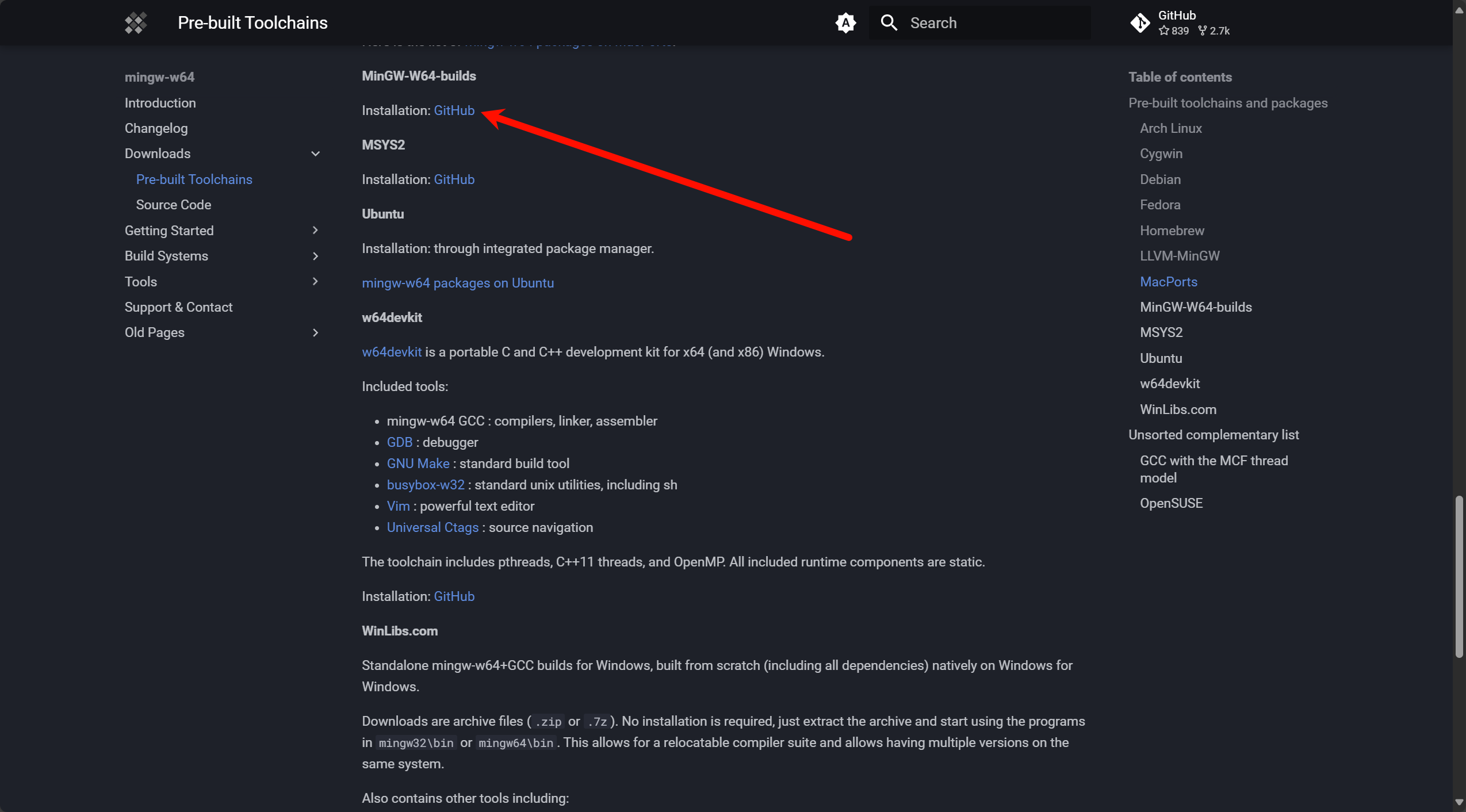 这里会看到 MinGW 针对不同的操作系统和环境有不同的构建版本,我们往下找到并点击MinGW-W64-builds,然后点击Installation转到 Github 界面